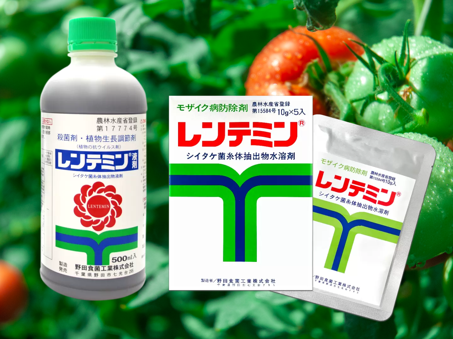 認できました。その際に農家の方から「ウイルス病が減っている」との報告を受けました。当時、このシイタケ菌糸体抽出物は、人のウイルス病(B型肝炎やヘルペスなど)に対する効果が確認できており、植物のウイルス病にも効果がある可能性がありました。植物のウイルス病は、タバコだけではなく、多くの農作物で深刻な問題になっており、発生するとあっと言う間に畑全体に広がり、効果のある農薬もありませんでした。現在でも植物のウイルス病に対する農薬はほとんどありません。そこでシイタケ菌糸体抽出物の植物のウイルス病に対する研究が始まりました。農林水産省や農業試験場、日本植物防疫協会などで様々な試験を行い、ウイルスへの効果が確かめられ、1983(昭和58)年8月に日本初の抗ウイルス剤「レンテミン」が誕生しました。また、1994年(平成6年)には家庭園芸肥料「バイオエドレンスL」を発売しました。